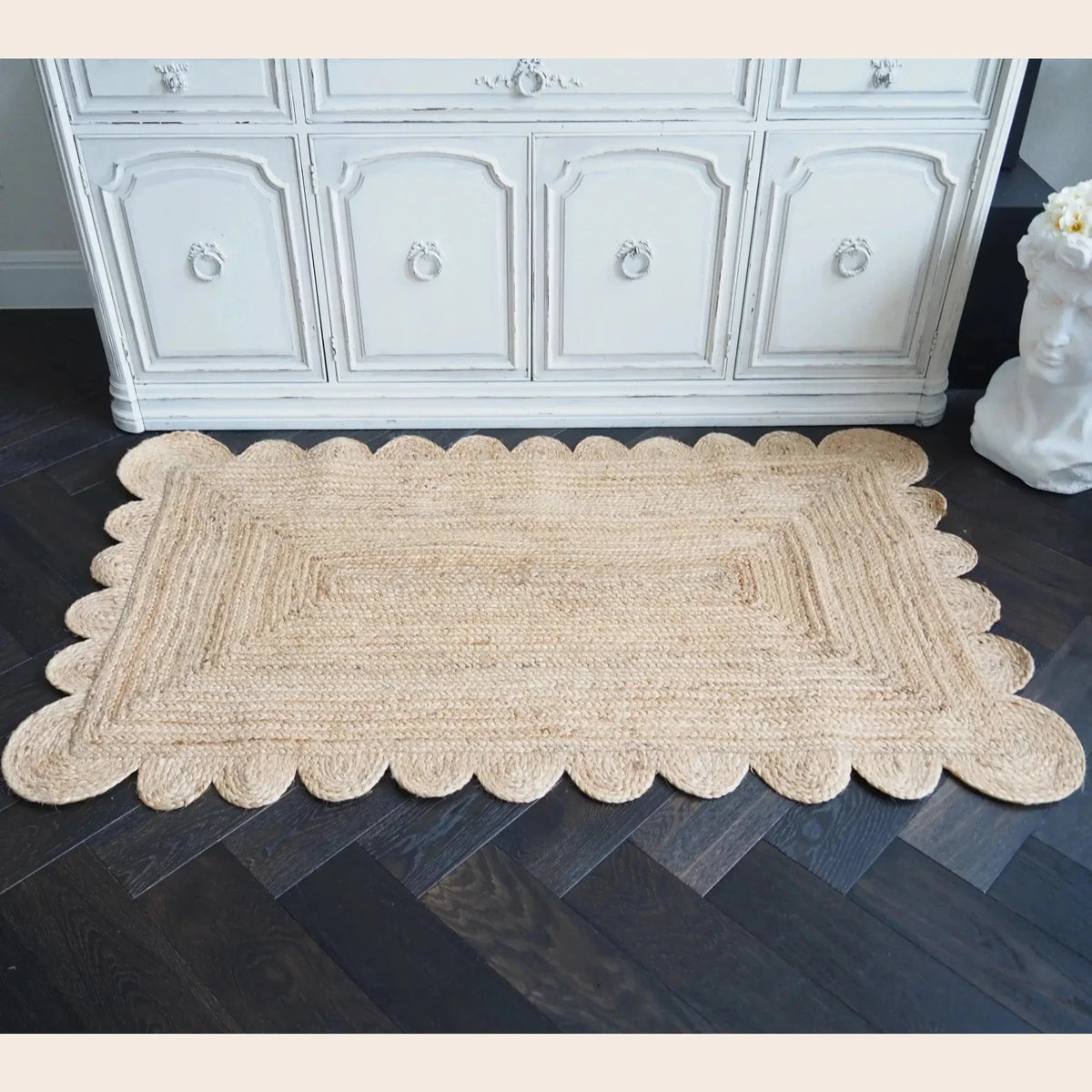 This Handmade Scalloped Jute Rug is kid and pet friendly, making it suitable for high-traffic areas such as your living room, dining room, kitchen, office, and entryway.