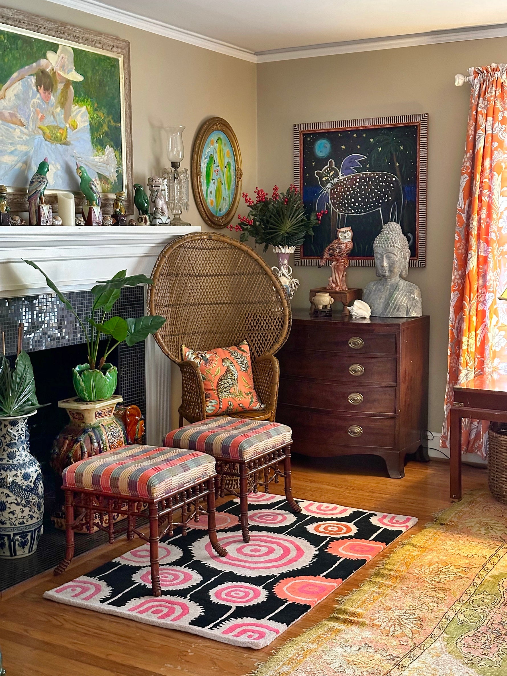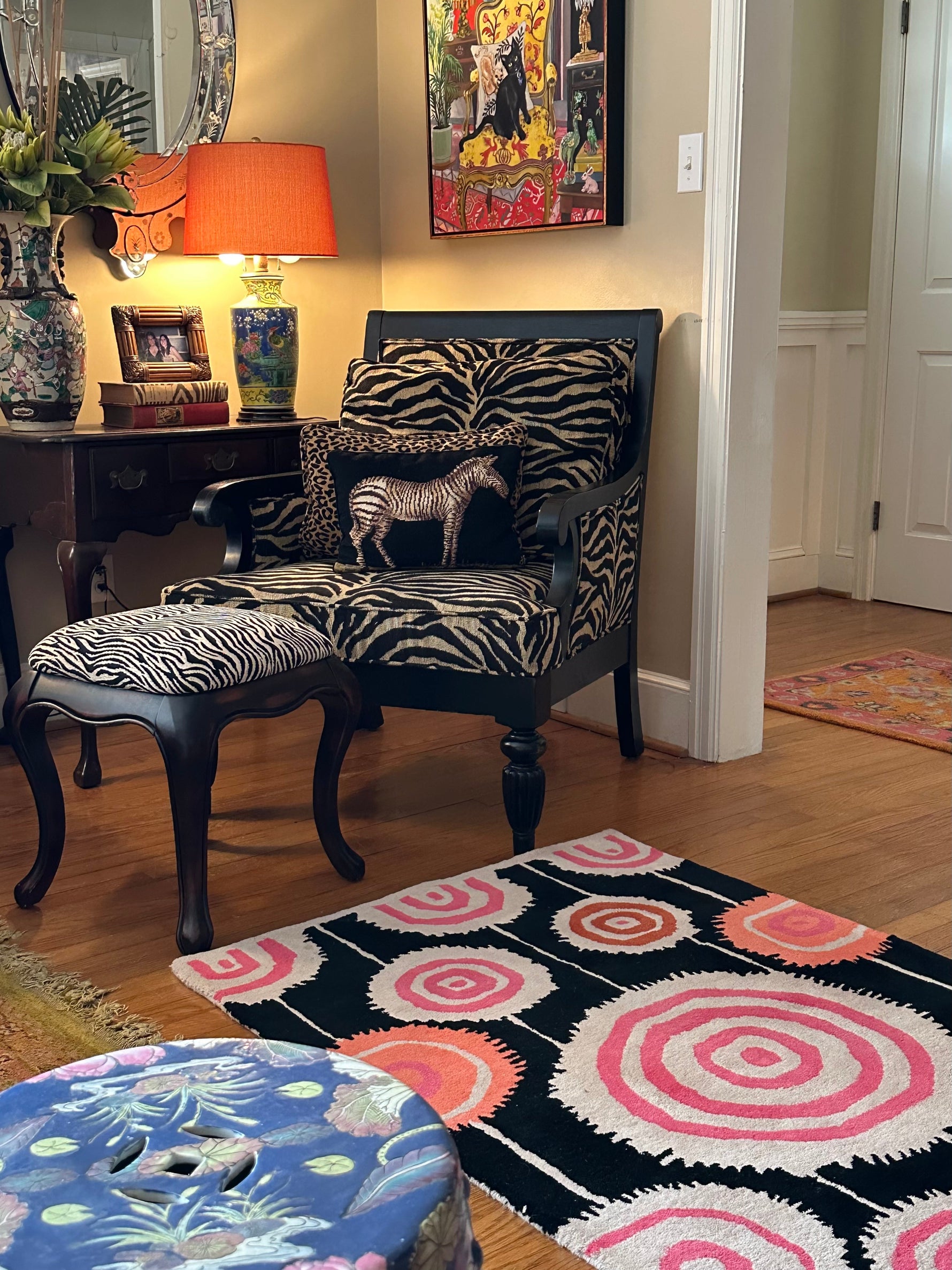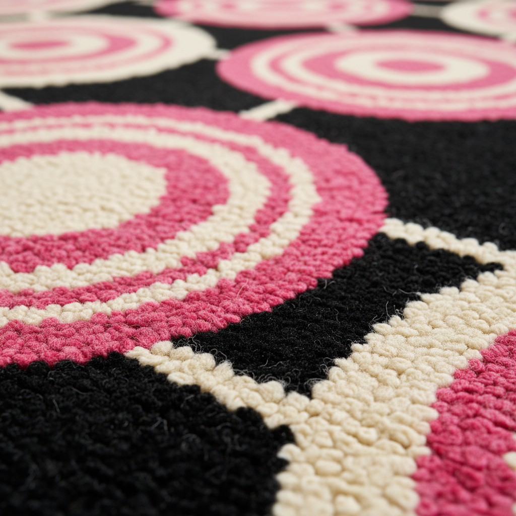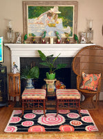 Your living room will feel more alive and stylish with the Orbit Bloom Hand Tufted Rug. With its hypnotic pattern of floral-inspired rings in warm pinks and oranges set against a bold dark background, this rug makes a strong visual impact. Its pattern is a rhythm that makes me think of the beauty of planetary circles. This makes it a great statement piece for modern, eclectic, or bohemian rooms. The Orbit Bloom Hand Tufted Rug is both an artistic focal point and a cozy base for your home. It is soft to the touch and made from high-quality materials that will last.