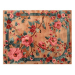 There are pretty flowers and birds on this rug, and the background is a nice peach color. The tangle of thin twigs around the pink, blue, and red flower stems creates a beautiful effect. The presence of birds sitting in the trees creates a feeling that is both active and calm. It looks wonderful and brings greenery into any room. It looks retro because of the artistic frame and soft but bright color scheme. It goes with both old and new decor.