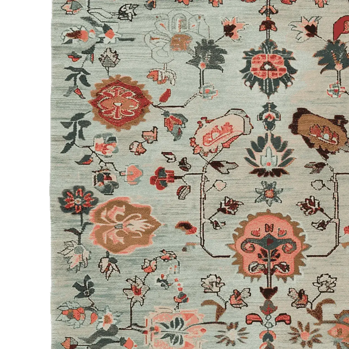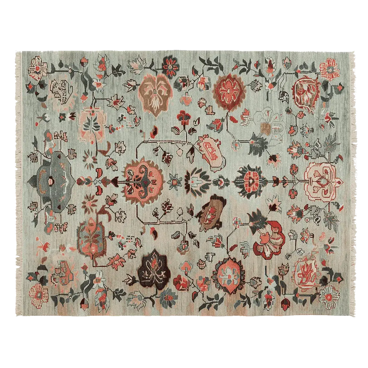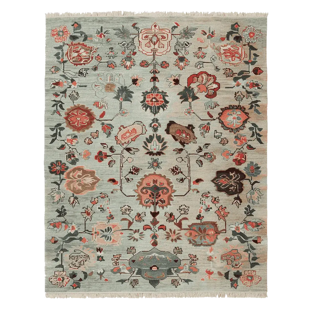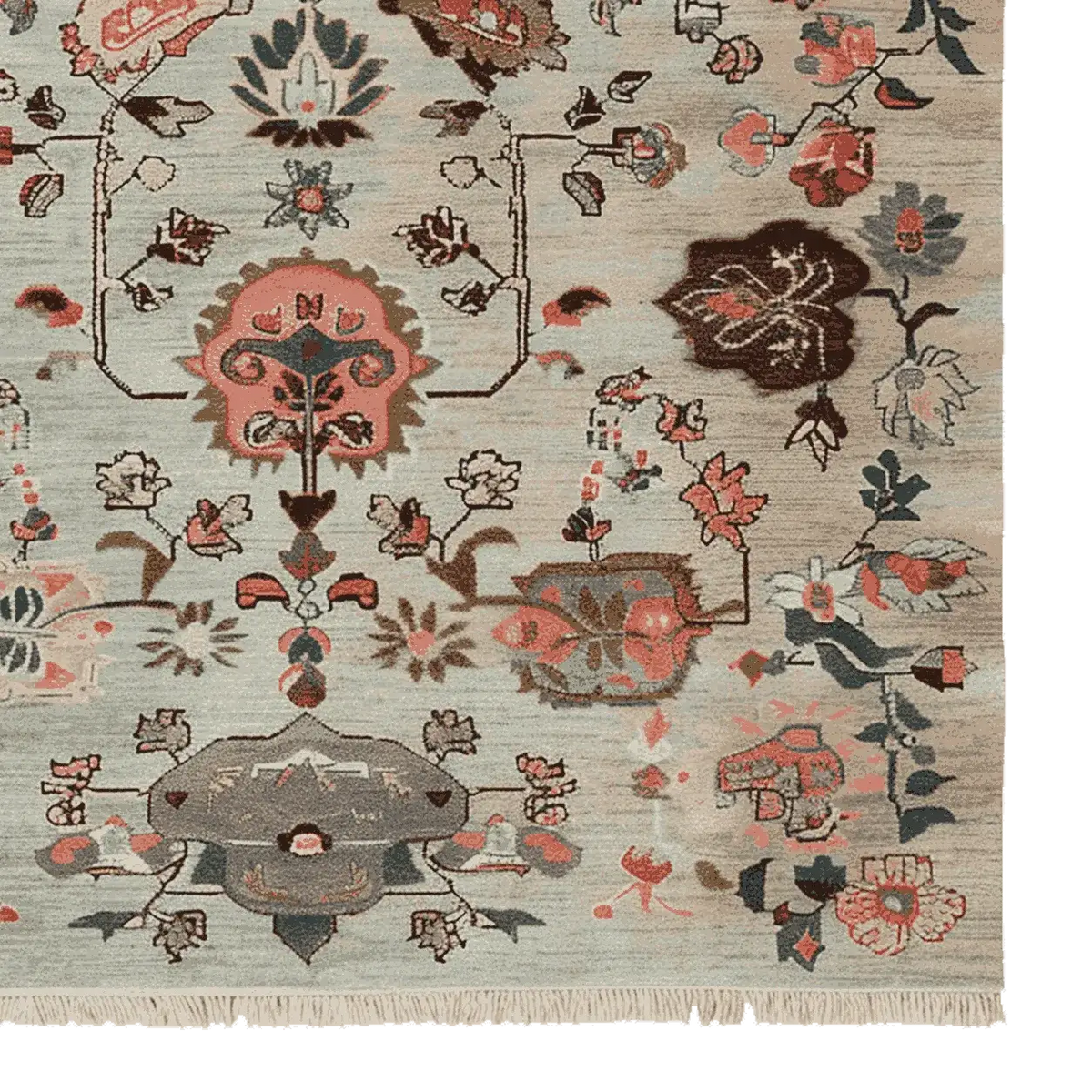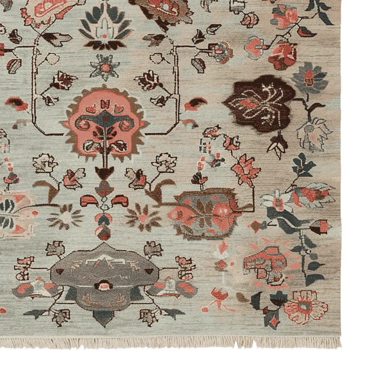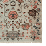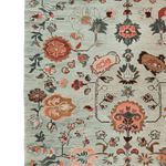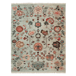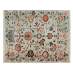 This exquisite Ornate Floral Weave Hand Knotted Rug features a delicate arrangement of floral motifs woven into a serene, muted background. The soft blue-grey base is adorned with intricate botanical patterns in warm terracotta, deep brown, and subtle ivory tones, creating a timeless yet contemporary aesthetic. Inspired by traditional Persian and Turkish designs, the rug evokes a sense of elegance and heritage, making it a perfect statement piece for any interior space. Its hand-knotted texture and fringed edges add an artisanal touch, enhancing both its beauty and craftsmanship.