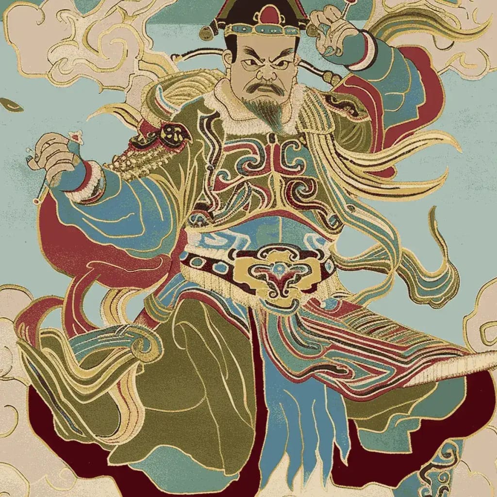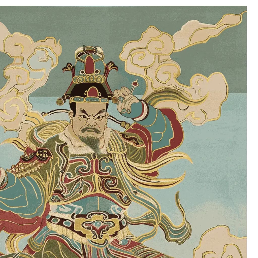 This Storm Bringer Hand Tufted Rug shows a royal fighter standing in the middle of moving clouds, which stands for power, strength, and divine authority. The complex pattern was inspired by traditional Chinese art. It uses rich shades of teal, gold, and earth tones to make a work of art that is both beautiful and culturally significant. This rug is powerful and beautiful, and it would look great as a display piece.