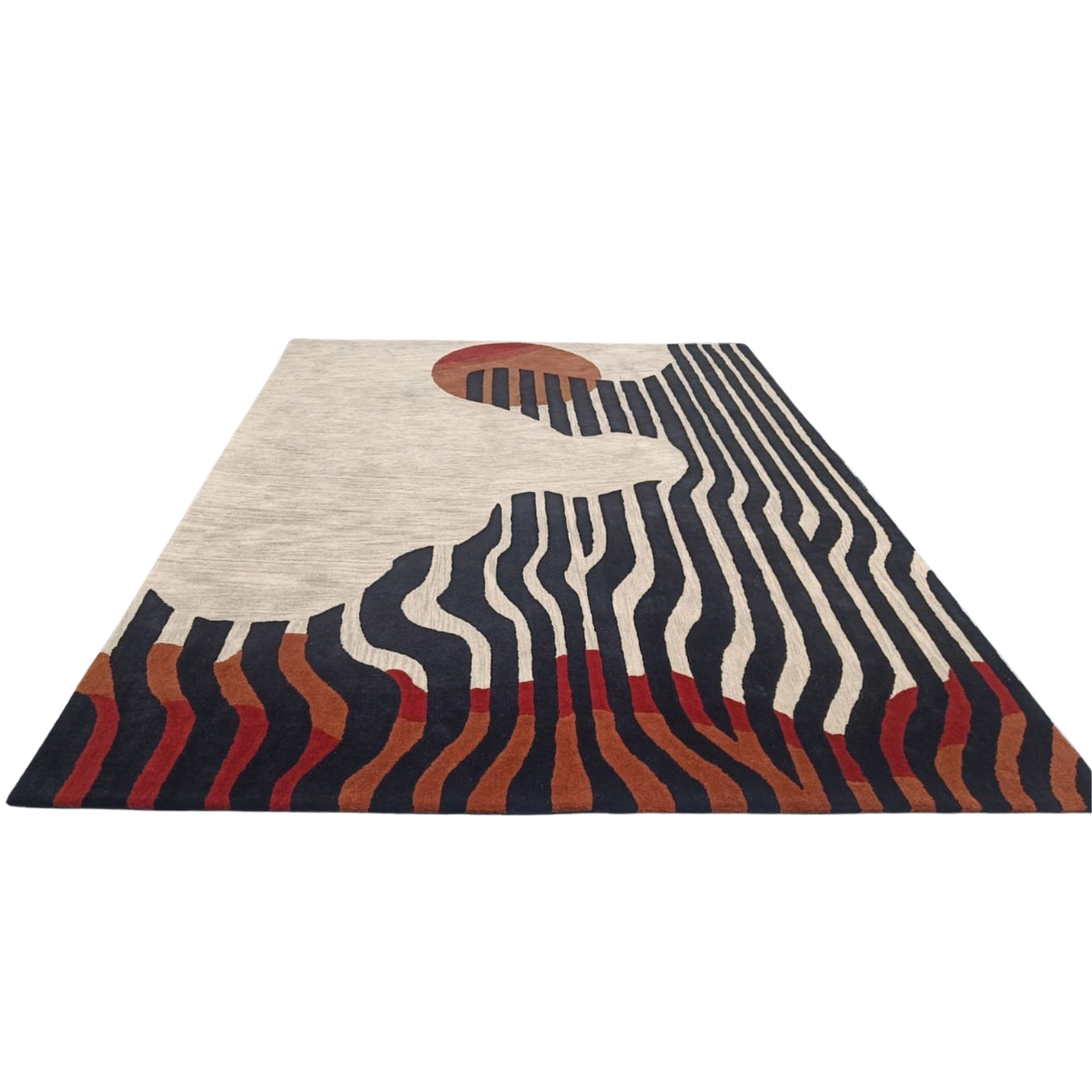 The Energy Pulse Tufted Wool Rug is a lively piece with lots of energy. Its bright colors and patterns make it pop. It looks good and keeps you warm because it's made of soft wool. This rug is great for making a statement in your home because it looks great and lasts a long time.