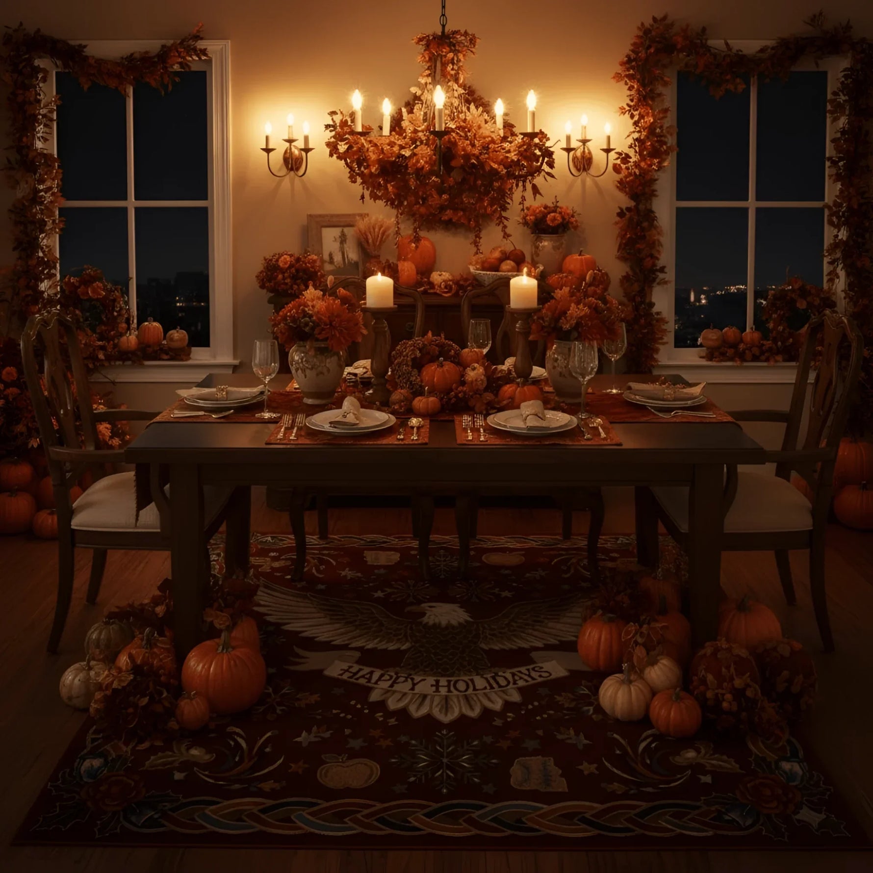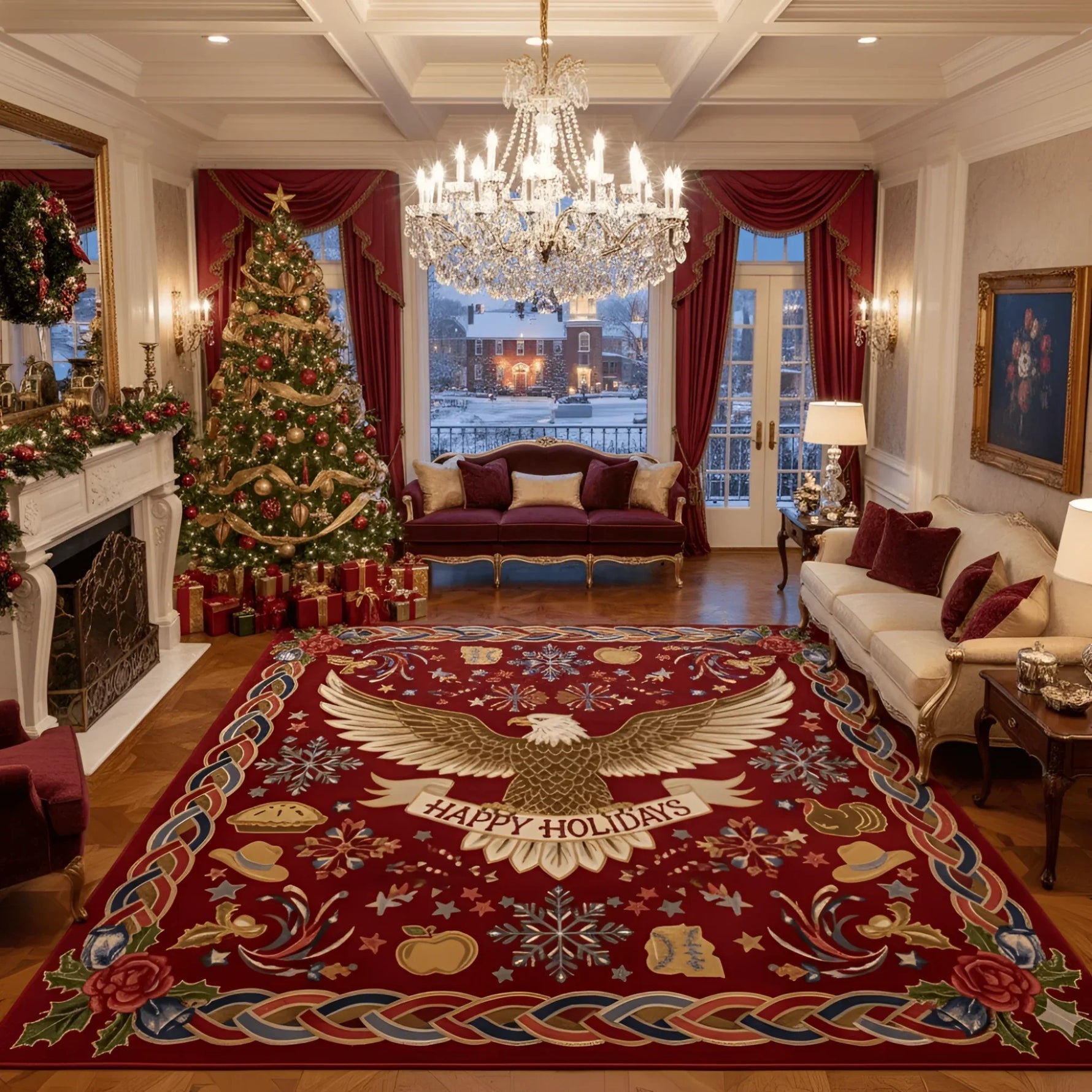The magnificent design features a bold central bald eagle over a rich, cranberry-red field, surrounded by traditional seasonal and patriotic motifs, including festive Celtic knot work, scattered snowflakes, and symbols of harvest celebration.