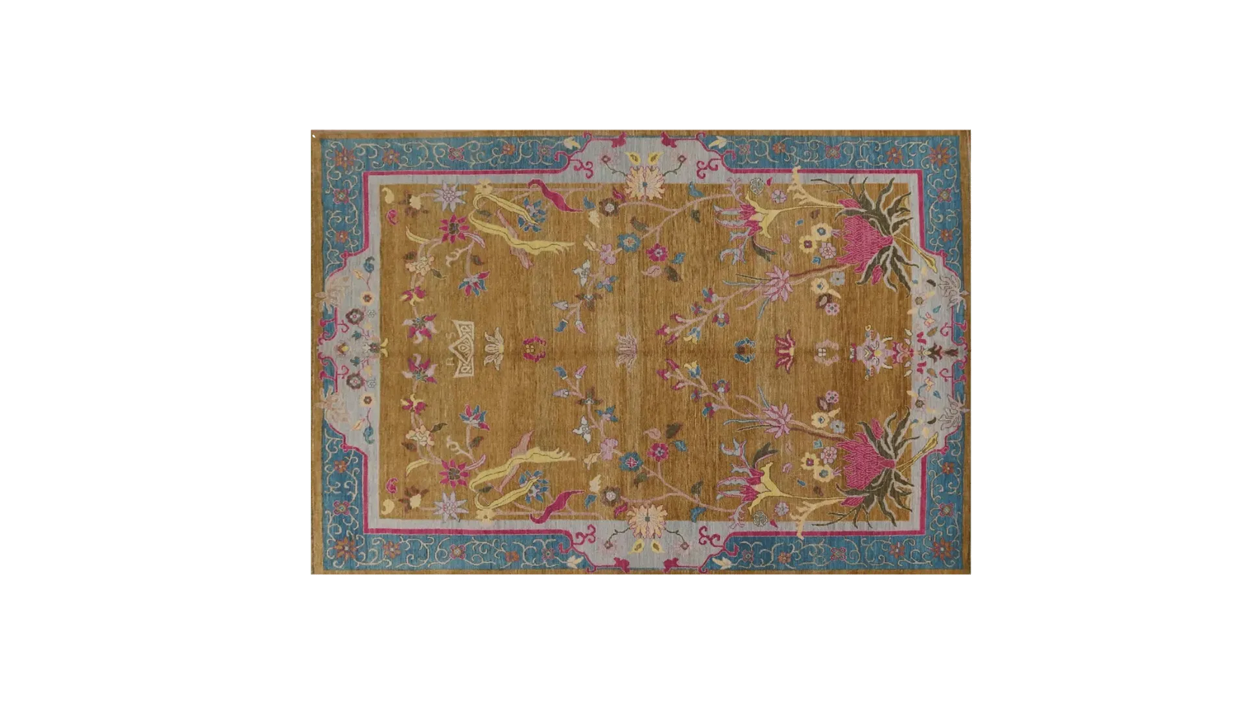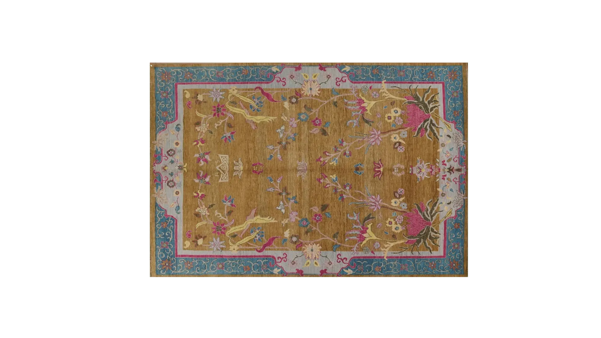 Celebrate and preserve artisan handcrafts and global traditions around the world with our Blue Bordered Spring Floral in the Golden Sky Wool Hand Knotted Area Rug.